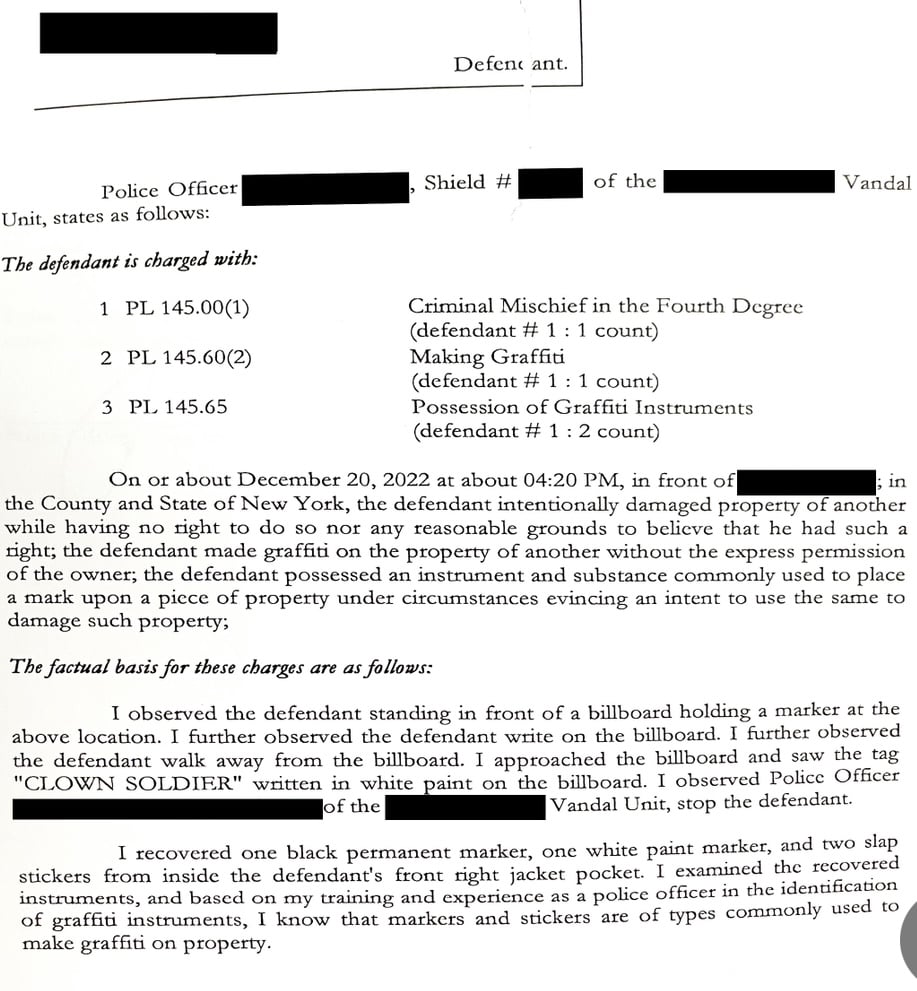 I was charged with Criminal Mischief of the Fourth Degree, Making Graffiti and Possession of Graffiti Instruments. On or about 4:20 pm the defendant intentionally damaged property of another while having no right to do so nor any reasonable grounds to believe that he had such a right; the defendant made graffiti on the property of the owner; the defendant possessed an instrument and substance commonly used to place a mark upon a piece of property under circumstances evincing an intent to do the same to damage property;