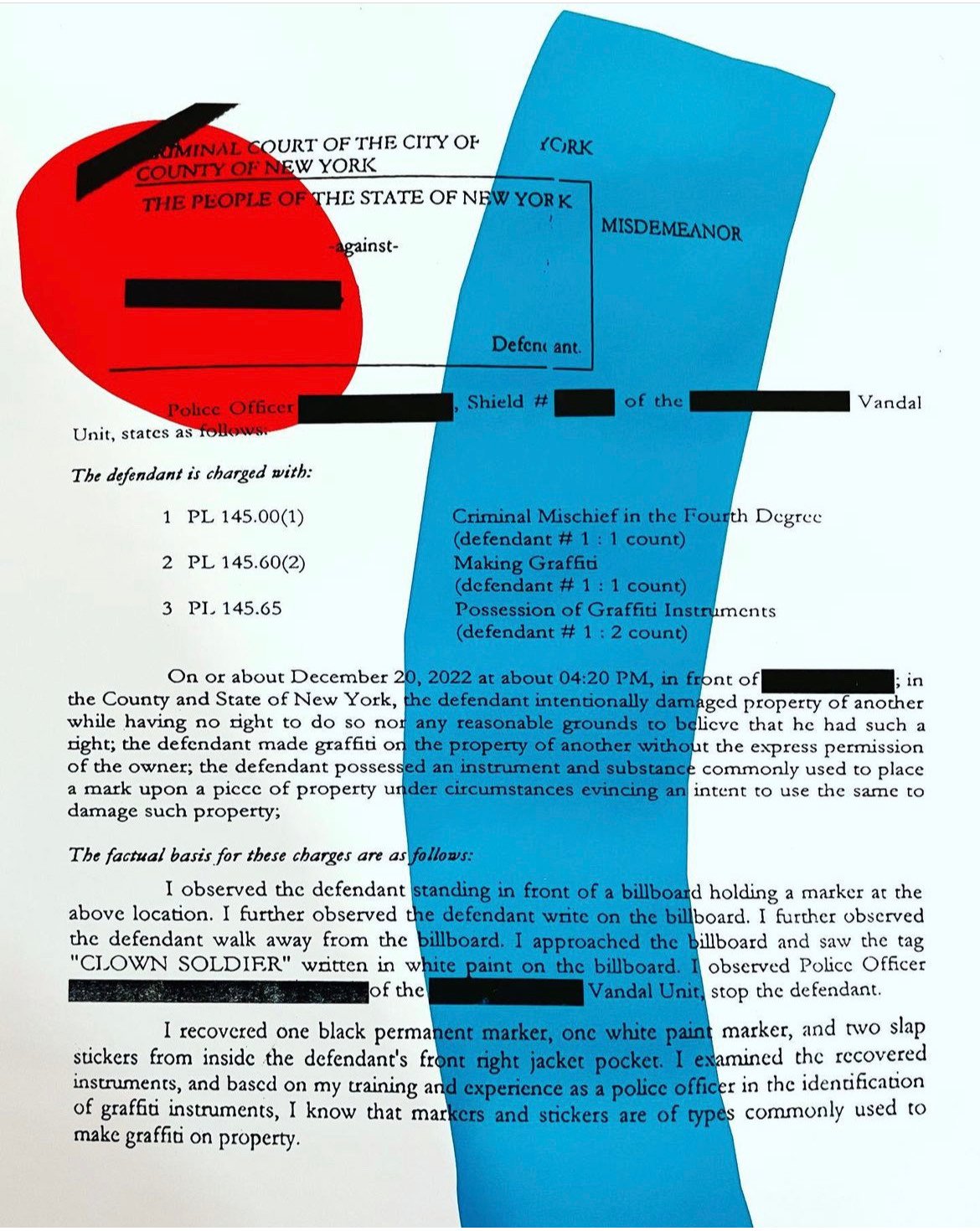 The factual basis for these charges are as follows: I observed the defendant standing in front of a billboard holding a marker at the above location. I further observed the defendant write on the billboard. I further observed the defendant walk away from the billboard. I approached the billboard and saw the tag " CLOWN SOLDIER" written in white paint on the billboard. I recovered one black permanent marker, one white paint marker and two slap stickers from inside the defendant's front right pocket. I examined the recovered instruments and based on my training and experience as a police officer in the identification of graffiti instruments, I know that markers and stickers are types commonly used to make graffiti on property.